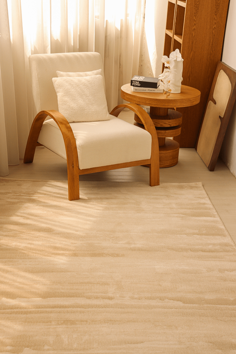 The Sand Oasis carpet features soothing beige tones with subtle tonal waves that evoke the tranquility of shifting desert sands. Its minimalist design and velvety texture bring warmth and calm sophistication to modern, serene interiors.