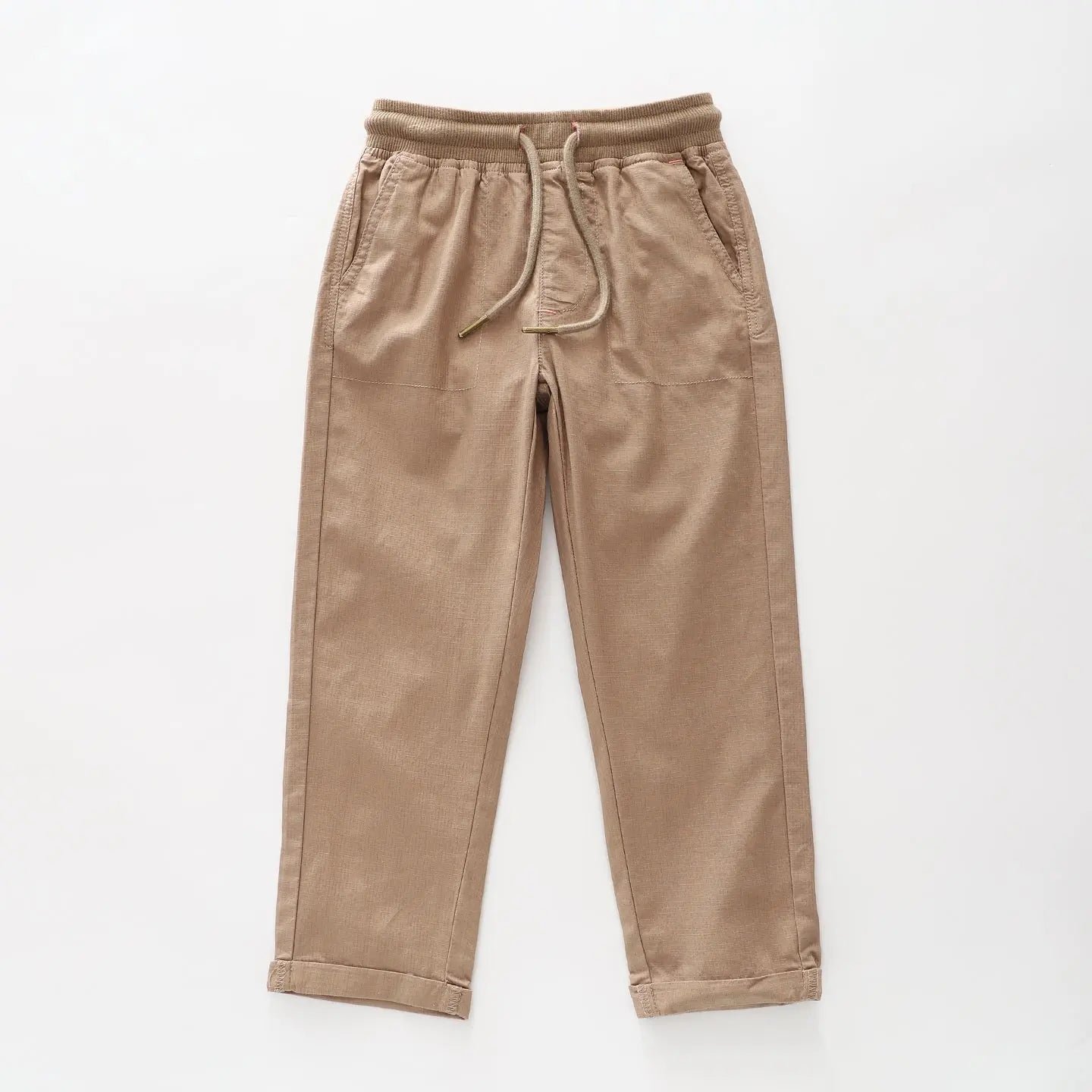 Our boys Khaki Casual Pants will be in high rotation for a simple summer style. Made with a lightweight woven material. these straight leg boys pants have a comfortable ribbed waistband with real shoelace ties for adjusting the fit. practical pockets for stashing treasure and turned up cuffs for a touch preppy style.