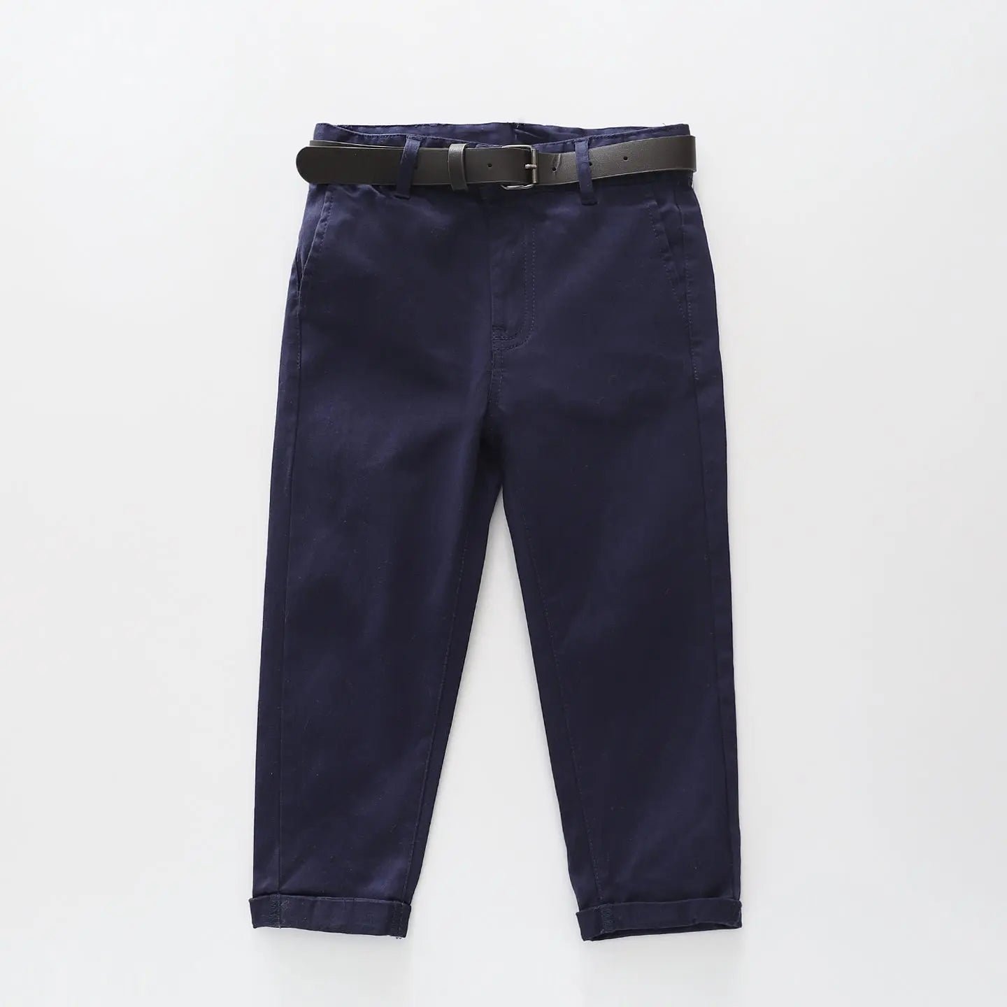 This Navy Chino Pant with Belt set is effortlessly versatile. A classic straight leg with cuffed hem. these slacks feature an adjustable waist. practical pockets and a functional fly. Elevate his look with a collared shirt. or pair with his favourite tee for a relaxed outing.