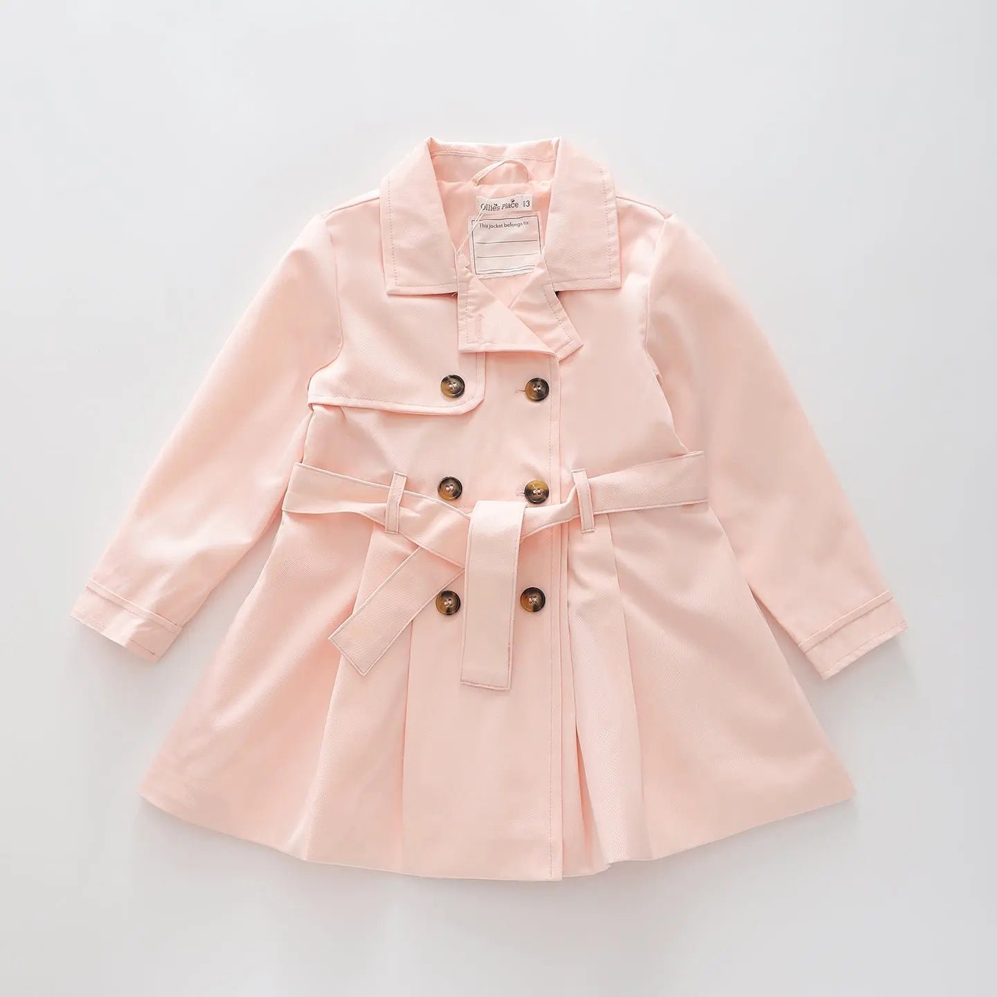 A chic essential. our girls Pink Trench Coat is an elegant layer that adds sophistication to any outfit. This beautiful double breasted trenchcoat is made with a durable cotton twill. featuring a box pleat waist and detachable belt tie. this pale pink jacket exudes charm.