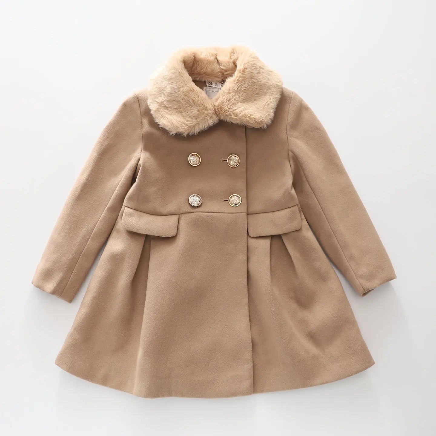 Stylishly cosy. our girls Tan Faux Fur Swing Coat is an elegant blend of sophistication and functionality. This warm tailored jacket is double-breasted and adorned with ornate buttons. adding a touch of utilitarian detail. Designed with a luxurious detachable faux fur collar and A-lined silhouette. this girls coat is a chic addition to any outfit.